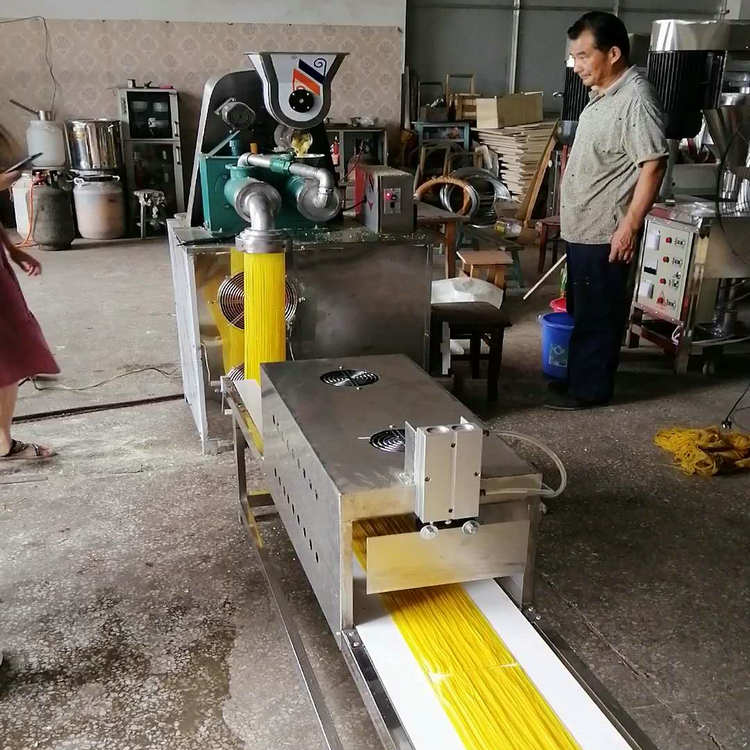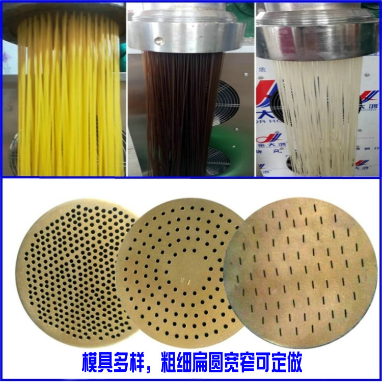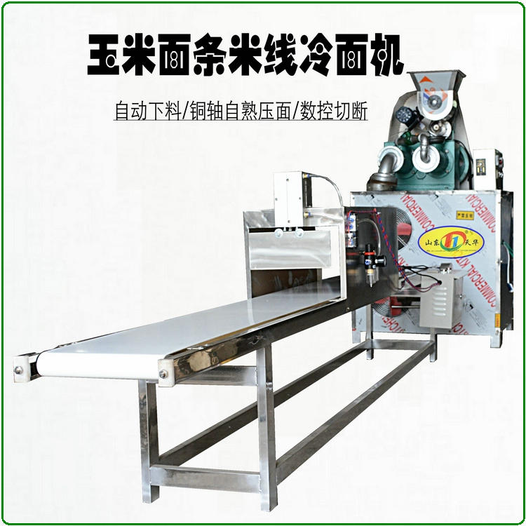 天華自熟冷面機(牛筋面機)結構合理,造型美觀,由自動下料器、雙銅軸壓面機、數(shù)控切斷機組成,自動下料器由調速電機帶動,通過快慢速度調整喂料的多少,壓面機采用螺旋擠壓生物變性工藝,無需外加熱源,利用軸筒旋轉與原料摩擦揉擠產(chǎn)生的熱能,使原料到成品一次熟化成型,將玉米面、蕎麥面、小麥面等雜糧面通過冷面機綜合轉化成具有柔韌彈性特點的風味面食,更換不同的的模具可以加工不同粗細寬窄的形狀,產(chǎn)品外表光滑、柔軟可口、久煮不糊,保留原糧的特有營養(yǎng)成分和微量元素。自熟冷面機還可生產(chǎn)鋼絲面、牛筋面及各種雜糧面條等。成型的面食進入調速皮帶輸送機,由延時控制切斷裝置把面條切成所需的長短后即可包裝銷售。
